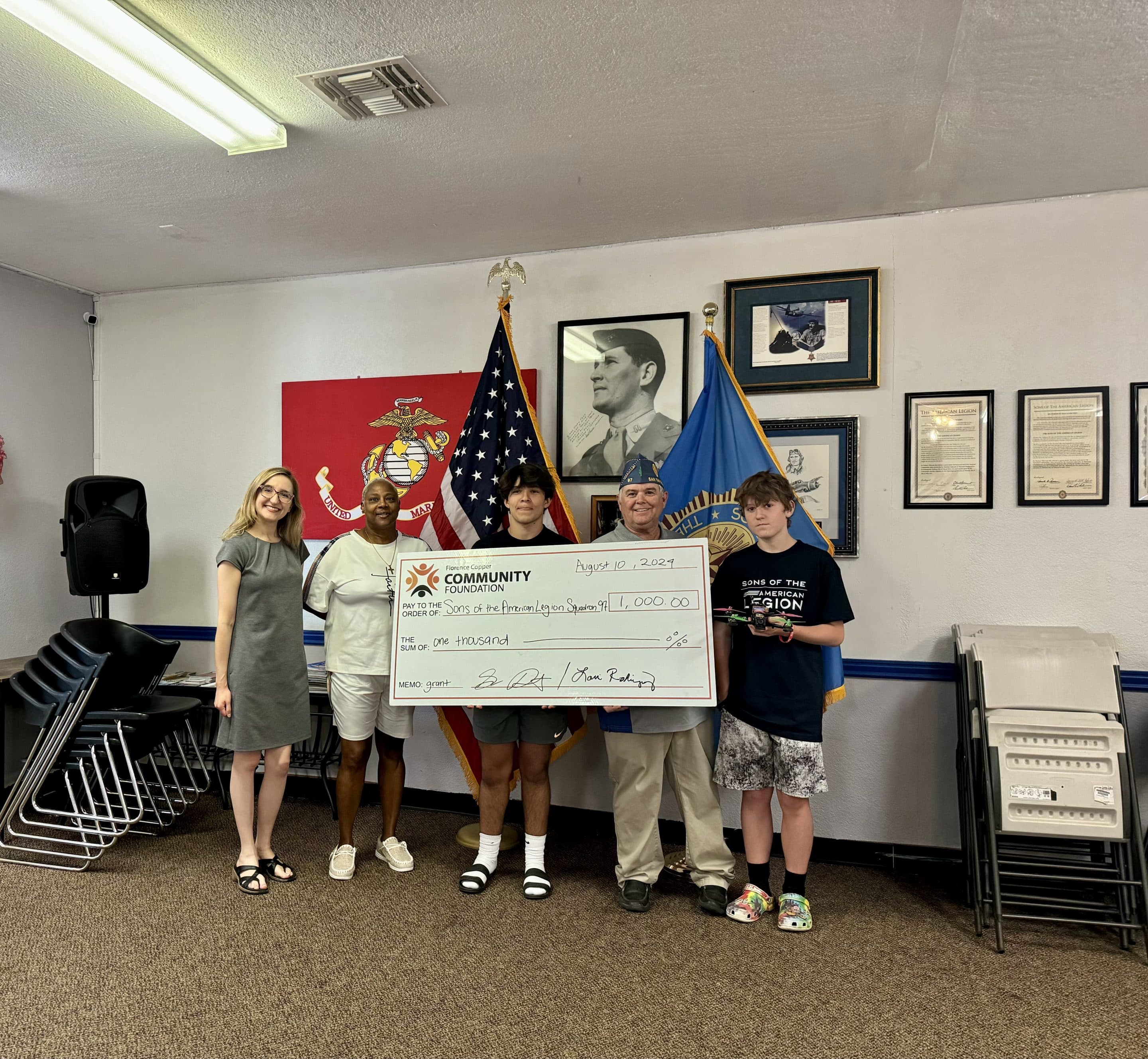 The Florence Copper Community Foundation is pleased to announce a $1,000 grant awarded to The Sons of The American Legion, Squadron 97. This grant will support the squadron’s newly developed youth drone program.